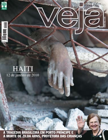 Puxei a revista e… O que aquela simpática senhora faz acenando ali embaixo? Sim, claro que a morte de Zilda Arns é importante. Mas enquanto a Época deu-lhe um lugar de destaque e em casamento adequado com a capa, apesar das críticas que já fiz, a Veja não só interrompe a foto que ‘sangrava’ por todas as margens, como também estraga completamente a sensação promovida nos primeiros momentos. Não sei se por motivos de marketing, que, sim, importa até nesses momentos; ou por… Não sei! Sei apenas que essa concessão criou uma ironia bizarra.