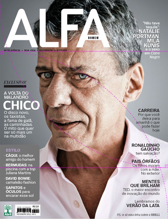 Nunca havia lido uma Revista Alfa antes. Sabia de seu lançamento, mas não havia me interessado por conferí-la até essa edição. Mantendo-me do lado de fora da revista e do meu gosto musical, falemos da foto, da capa. A luz vinda pela direita revela a idade do retratado e confere-lhe um ar de dignidade, de respeito muito forte. A imagem se equilibra muito bem sobre seus terços. O nariz, enorme, marcado pela textura dos anos, repousa sobre o primeiro terço vertical, enquanto o pescoço gira no eixo do segundo. As sobrancelhas pesadas estão logo acima do terço horizontal superior. Para chamar mais atenção do que isso, apenas se estivesse invertida.